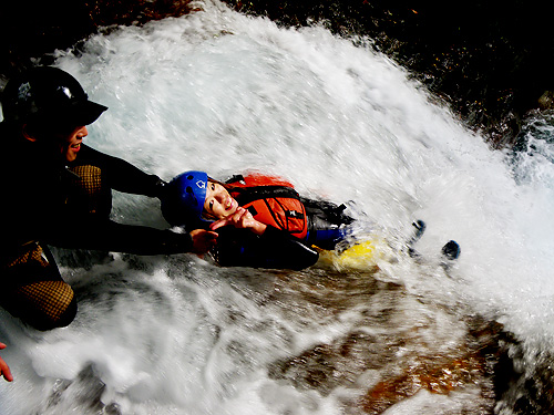 「キャニオング」とは、川の水の流れと共にすべって遊んだりしながら、川を下っていくアウトドアスポーツ。